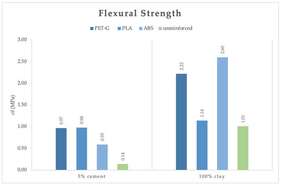 The mechanical properties of the mortar series with integrated meshes, tested after 28 days of curing, are exhibited in Figure 14. PETG, PLA, and ABS meshes were placed between printing layers in two different mortars: 100% clay and 5% cement. Firstly, it can be seen that the meshes, even after 28 days, have increased flexural strength. Again, it is clear that the 100% clay mortar provides higher flexural strength than the 5% cement mortar.