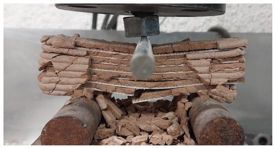During the test, shear failure was observed in all mortars, with two diagonal cracks propagating down the specimen from the loading point. The layers then began to detach from each other one by one until the meshes, in most cases, started breaking in half. The stiffness of the polymeric meshes was an important factor, along with their integration with the matrix. In the 5% cement mortar, PETG meshes did not break because the poor integration of the two materials, combined with the flexibility of the mesh, caused the printed layers to separate quickly, leading to composite failure. This issue was avoided in the 100% clay mortar due to better incorporation of the materials. The PLA and ABS meshes failed with a central crack starting from the bottom mesh, and most of the time, one or two broke. Figure 15 demonstrates the failure of a 5% cement specimen reinforced with an ABS mesh.