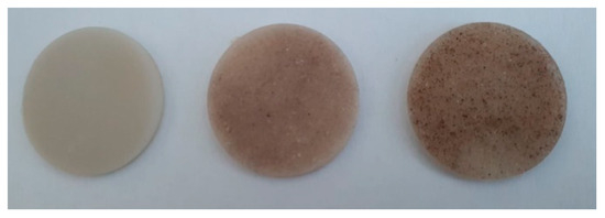The polymer composite materials type PP/CMC were obtained in two stages, i.e., composite pellets by extrusion, by use of a laboratory twin screw extruder Lab-Compounder KETSE 20/40 (Brabender, Duisburg, Germany), followed by a melt injection process with a Dr. Boy 35A injection-molding machine (Germany) in order to obtain testing samples. As regards the injection process, the working temperatures of 170–230 °C and clamping forces of 138–155 kN were used to achieve disk-shaped materials with a diameter of 30 ± 0.1 mm and a thickness of 2 ± 0.1 mm. To obtain the PPrr/CMC type composites, 3 concentrations of CMC were used, and the performances obtained for each were compared in order to select an optimal variant for the proposed use. Thus, the concentrations and coding of the 3 types of composites were presented in Figure 1 and Table 1. Regarding the extrusion process, temperatures were used on the areas of the extruder, in the range of 190–240 °C, and in the injection process, working temperatures of 170–230 °C (Table 1) and forces of 138–155 kN were used to make disk-shaped materials with a diameter of 30 ± 0.1 mm and a thickness of 2 ± 0.1 mm. To obtain the PPr/CMC type composites, 3 concentrations of CMC were used, and the performances obtained for each were compared in order to select an optimal variant for the proposed use. Thus, the concentrations and coding of the 3 types of composites were presented in Figure 1 and Table 2.