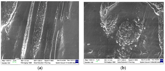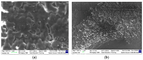 Scanning electron microscope with field emission source and focused ion beam from ZEISS—for scanning electron microscopy analysis SEM was performed with. This equipment is dedicated to the study of microscopic structures and inorganic and organic surfaces. The images were taken at an acceleration voltage of 5 kV with a working distance of 4.3–4.5 mm. The detector used was the secondary electron detector of the Everhart Thornley type with the Faraday cup in the sample chamber—resulting in micrographs that highlight the morphology and topography of the analyzed surfaces. Also, we employ an active load compensation system (local) with N2 gas used on the surface of the analyzed sample (CC—charge compensation).