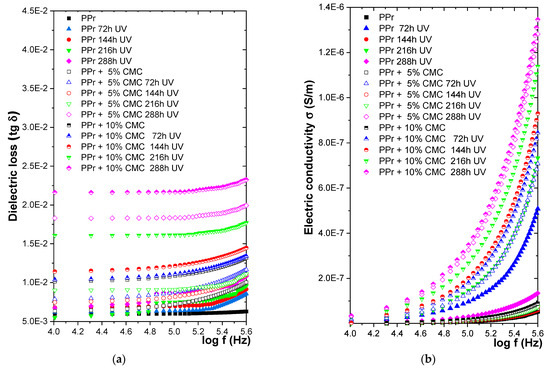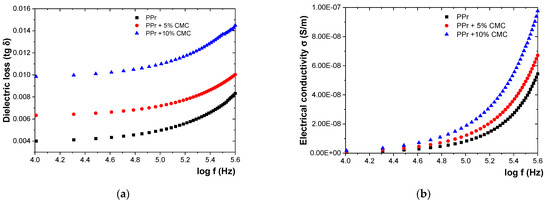 From Figure 7, it is observed that increasing the percentage of CMC in the polypropylene leads to a significant rise in both the loss tangent (tg δ) and the conductivity (σ) of the composites. Specifically, for the PPr + 5% CMC composite, tg δ and σ increase by approximately 29.23% and 26.68%, respectively. For the PPr + 10% CMC composite, these increases are even more pronounced, with tg δ and σ rising by approximately 90.7% and 85.4%, respectively.