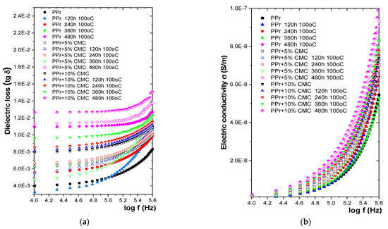 Figure 8 shows the variation of electrical characteristics with frequency for samples subjected to a temperature of 100 °C for 120, 240 h, 360 h, and 480 h. An increase in electrical conductivity is observed for all composites studied after 480 h of exposure to temperature. Table 6 shows the variations in % of the values of the dielectric characteristics related to the PPr base polymer for samples subjected to the action of temperature.