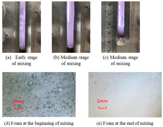 According to the experimental results, the foaming volume of the blowing agent and liquid CO2 is low. Therefore, after mixing thoroughly by stirring, the foam occupies only a tiny part of the volume in the piston. The upper part of the foam is a mixture of CO2 and the blowing agent, and the foam will not be injected into the rock center during the replacement, which ensures a pure gas injection environment (as shown in Figure 7).