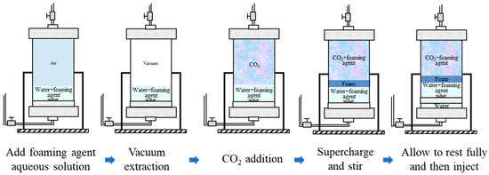 A visual high-temperature and high-pressure foaming apparatus was used to evaluate the foaming performance of the agents. The experimental steps and experimental flowchart are shown in Figure 2 and described as follows: