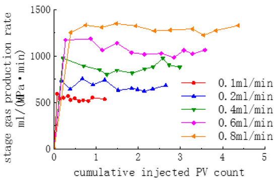 The gas flow rate graphs of the core with one fully open fracture at different injection rates are shown in Figure 8. With the increase in the injection flow rate from 0.05 to 0.8 mL/min, the gas production rate in the late stage of replacement gradually increased from 421.36 to 1326.86 mL/(MPa·min).