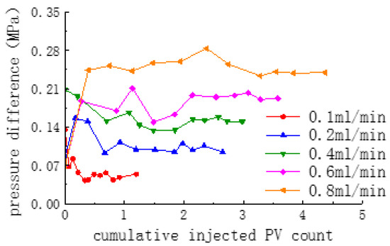 The effect of different injection flow rates on the degree of replacement from a fully open fracture core is shown in Figure 9. The figure shows that as the injection flow rate rises, the replacement degree shows a tendency to first increase and then decrease. In the replacement process of a fractured core, oil is first transported from the matrix into the fracture and subsequently carried out of the core by the CO2 + blowing agent. Too low a flow rate results in a low amount of CO2 being injected, while at the same time, the differential pressure is low (as shown in Figure 10, the higher the flow rate, the higher the differential pressure). The amount of diffusion into the fracture will be even lower, preventing the effective movement of crude oil from the matrix. However, if the flow rate is too high, although the differential pressure rises, in that case, the flow rate of the gas is too fast, which is also unfavorable to the diffusion of CO2 into the matrix, leading to a decrease in the degree of recovery.