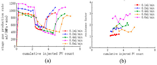 Stage gas production rates (a) and the resistance factor (b) at different injection rates.
