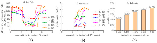 Comparison of (a) the stage gas production rate, (b) the drag factor, and (c) the blocking rate at different injection concentrations (0.4 mL/min).