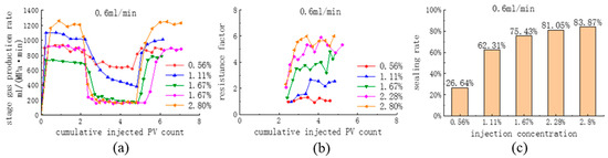 Comparison of (a) the stage gas production rate, (b) the drag factor, and (c) the blocking rate at different injection concentrations (0.6 mL/min).