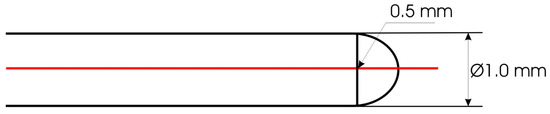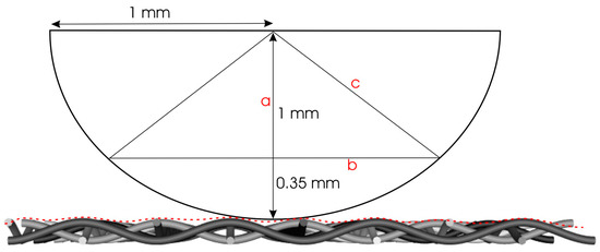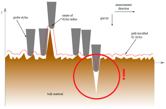 In Figure 5, a side view of a hemispherical stylus is shown. The semi-spherical stylus moves across the surface, probing the profile with its spherical cap. Given the contact width of the path of 1.520 mm, 0.76 mm on either side of the central point (D03), any contact with relief outside the central part of the stylus can cause lateral shift that will not be visible in the roughness profile (Equation (1)). This situation can lead to misinterpretation of the profiles, as it may actually measure two or more roughness profiles with lateral displacement, resulting in profiles with higher peaks.