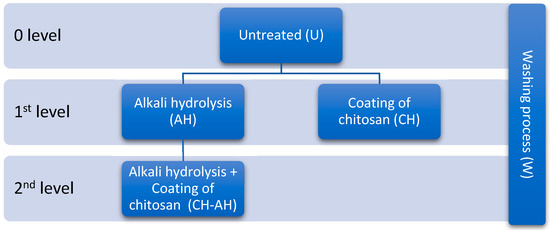 Considering that polyester as a synthetic polymer and chitosan as a biopolymer are incompatible, it was necessary to conduct a pretreatment through alkaline hydrolysis (AH). This treatment was carried out using a NaOH solution (w = 2%) at a temperature of 98 °C for 30 min in a laboratory device Polymat, Mathis, CHT Switzerland AG, Montlingen, Switzerland. After this thermochemical reaction, to remove oligomers from the surface of the polyester fabric, a gradual rinsing with water was conducted, first with hot water for two cycles and finally with cold water for two cycles. The samples were air-dried and stored in a closed space to avoid potential contamination from the environment.