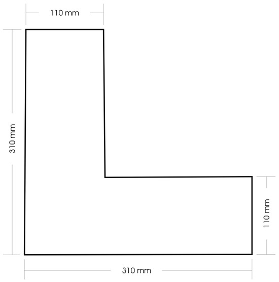 Prior to testing, the samples were prepared and conditioned in a standard atmosphere at 20 °C ± 2 °C with 65% ± 4% relative humidity. The sample was prepared using an ultrasonic cutter (Ultrasonic cutter for textiles TTS-400, Sonic, Rho, Italy) in the shape of the letter L with dimensions specified in the device’s operating instructions (see Figure 3).