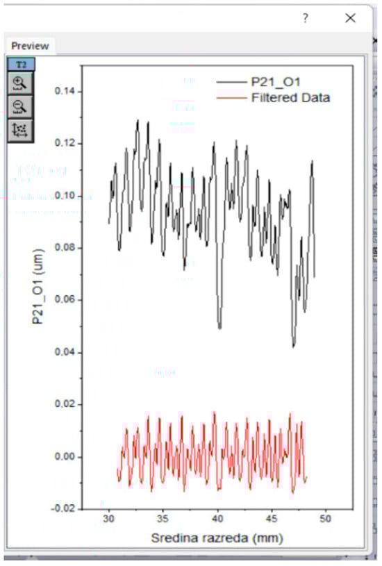 For the purpose of analysis, the data has been grouped so that the distance period for all points in the profile is equal. The roughness profile has been filtered to exclude wavelength components greater than 0.5 mm (cutt of) to avoid weave-related roughness and reduce the influence of the semi-spherical shape of the stylus, thereby achieving higher precision (Figure 7). Extremes that do not belong to the natural surface topography of the fabric have been identified, and valid ranges of data have been determined for processing, ensuring that the length of the profile evaluated is not less than five cutoff lengths.