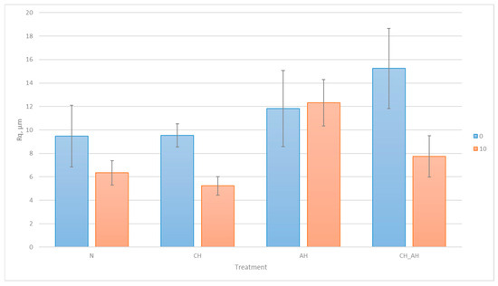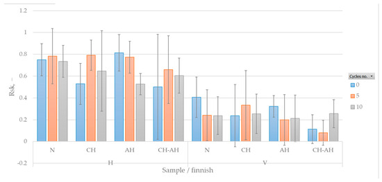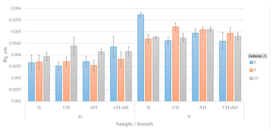 The chart is divided into two parts—H (horizontal roughness, i.e., roughness in the weft direction) and V (vertical roughness, i.e., roughness in the warp direction). The tested samples are as follows: U—untreated, control samples; CH—samples treated with chitosan; AH—alkaline hydrolyzed samples; CH-AH—alkaline hydrolyzed samples treated with chitosan. The color of the bars represents the number of washing cycles (5 and 10) to which each sample was subjected (graph legend). From the results shown in Figure 8, it is evident that there is no significant difference in the Rq parameter values based on the type and degree of sample treatment. Roughness increases with washing cycles, which is more pronounced after 10 washing cycles, while after 5 washing cycles, roughness can temporarily decrease (especially in alkaline hydrolyzed samples).