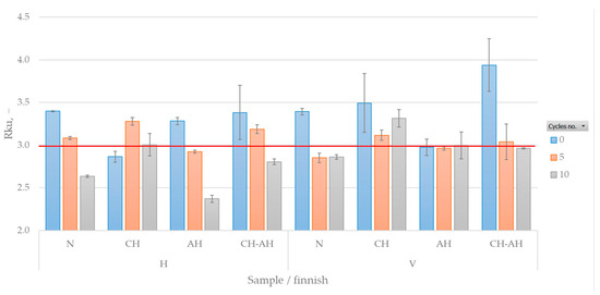 In Figure 9 it could be seen that the roughness profile increases with washing cycles (Rku takes lower values). Alkaline hydrolysis affects the surface morphology by resulting in smoother peaks. Alkaline hydrolysis causes the surface to peel, resulting in a loss of mass and decreased tensile properties, and creates a new, more porous and airy structure.