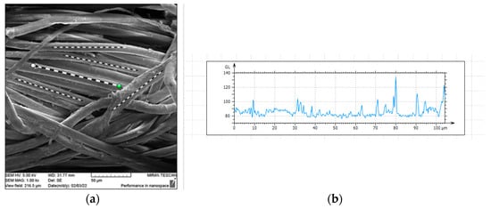 With the help of MountainsLab software, optical analysis of fiber roughness was conducted, with the roughness of five samples measured on each SEM image (Figure 11a). Images were obtained using a scanning electron microscope (SEM) and subsequently processed to obtain the roughness profile for each tested fiber (Figure 11b).