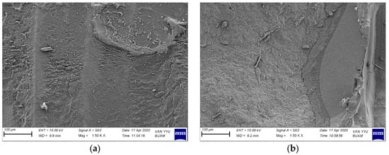 The SEM microphotographs presented in Figure 4 display randomly selected samples following the μSBS test. The images clearly showcase repair composite residues, indicating adhesive failure subsequent to the relevant surface treatments.