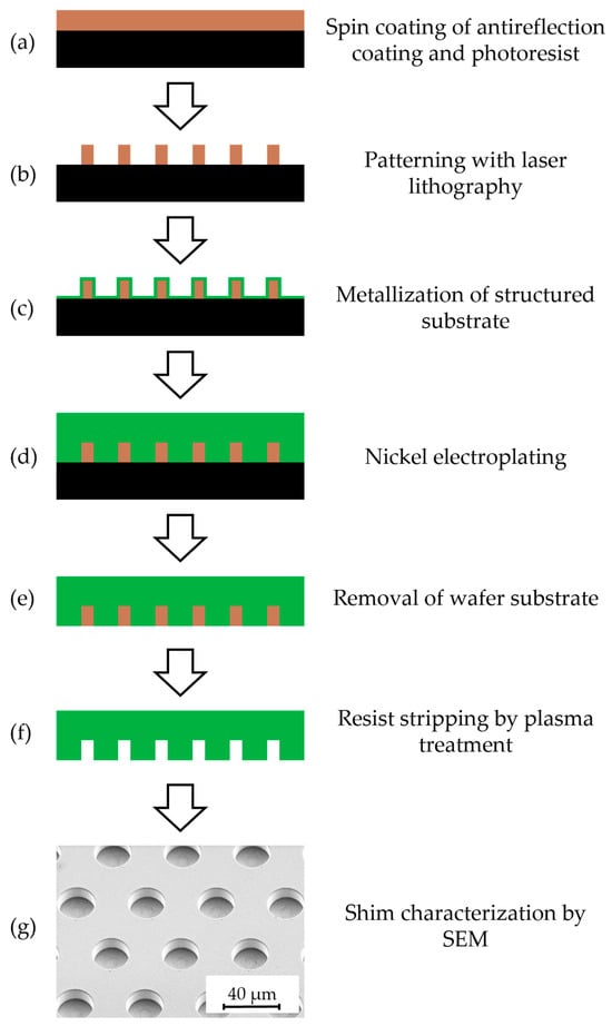 - The next step involved patterning a 10.2 mm × 10.2 mm area of the photoresist layer with pillar structures with a diameter of 10 µm and 20 µm, as well as depths of 10 µm, 20 µm, and 30 µm. The pitch between the individual pillars was 20 µm, 50 µm and 80 µm for different shims, respectively. The patterning was achieved at a power setting of 185 mW using a maskless Laserwriter DWL66fs (Heidelberg Instruments Mikrotechnik GmbH, Heidelberg, Germany) equipped with a ND:Yag laser (λ = 365 nm) and by use of a 10 mm write head. After exposure, a post-exposure bake in the oven UT 5050 LAF (Kendro Laboratory Products GmbH, Langenselbold, Germany) was carried out. The oven was ramped up to 75 °C in 15 min and returned to RT in 4 h without an additional holding time. During this process, the photoresist crosslinked at the exposed areas. Afterwards, uncrosslinked photoresist was dissolved with a developer like q-methoxy-2-propanol acetate (PGMEA) and isopropanol for 12 min and 15 min, respectively.