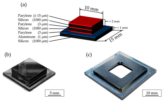 The silicon sample design is illustrated in Figure 4a,b. A chip stack design was implemented, consisting of a 1 mm thick silicon chip coated with a thin aluminum layer at the base, facilitating the subsequent separation of chips using aluminum wet etching in KOH. Two additional 1 mm thick silicon chips coated with a 3 µm Parylene C layer were bonded to this base chip using a T-3002-FC3 chip bonder (Dr. TRESKY AG, Thalwil, Switzerland). Bonding parameters included a temperature of 300 °C, a duration of 30 s, and an applied force of 6.45 N [11].