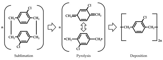 Molecular composition of the three-step CVD process of Parylene C according to Gorham [24].