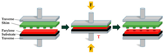In the initial phase of the process, both the Parylene-coated substrate and the shim were mounted onto the traverses accordingly. Following the initial setup, the process chamber was sealed and evacuated. Subsequently, by heating the traverses, the Parylene C was brought to a molten state at temperatures exceeding its melting point. During this phase, the shim mounted on the traverse was pressed into the molten Parylene C to imprint the desired structures.