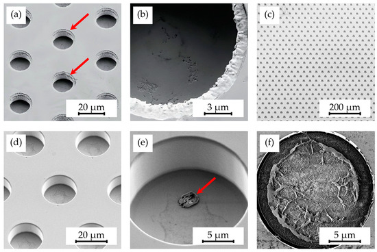 SEM images depicting microstructures on a shim after electroplating, showing (a) rough sidewalls (indicated by arrows) in the cavities and (b) unintended material undercuts, alongside (c) a fully processed shim with (d) defect-free structures, as well as shims featuring (e) minor resist residues (indicated by arrows) and (f) extensive resist residues.