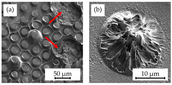 SEM images showing the detachments of (a) multiple pillars (indicated by arrows) and (b) individual pillar structures on samples annealed at 300 °C for 30 min caused by the hot embossing process at a 305 °C embossing temperature and 25 kN embossing force, as well as demolding at 40 °C with 0.2 mm/min.