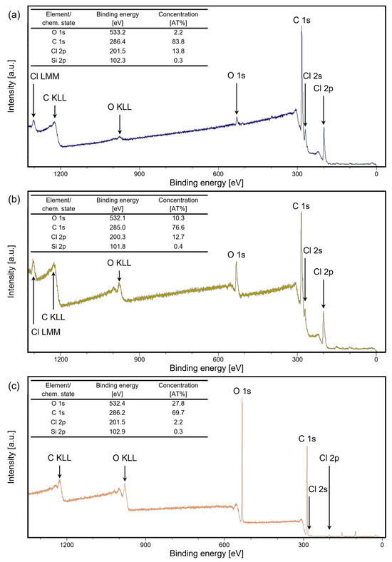 The XPS measurements depicted in Figure 10a–c provided insights into the chemical surface composition of Parylene-coated silicon chips post-embossing, with and without using a release agent. Compared to the untreated samples with only traces of oxygen from the sample preparation, a significant increase in oxygen content was observed, indicating a pronounced influence of surface modifications on the material’s chemical composition. Samples without a release agent exhibited a five-fold increase in oxygen content, suggesting the oxidation of Parylene C. This phenomenon implies that the vacuum conditions of around 10 mbar during the hot embossing process were insufficient to prevent oxidation, as demonstrated by another study where higher vacuum levels (<10−3 mbar) successfully mitigated such oxidation effects [8]. Given that the biocompatibility of oxidized Parylene C has not been conclusively proven, an additional motivation for transferring the hot embossing process to the chip or wafer level is, for instance, to utilize chip and wafer bonding equipment for hot embossing processes. This approach enables the execution of hot embossing processes under higher vacuum conditions, thereby potentially enhancing the overall process reliability and outcomes.