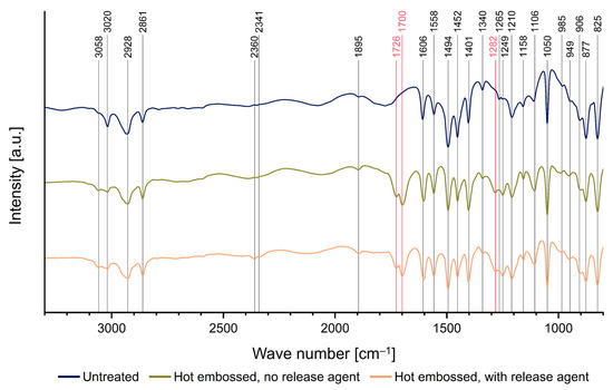 In addition to the XPS measurements, FTIR spectra were recorded to obtain depth signals and insights into the influence of process parameters within the bulk material, as illustrated in Figure 11. The corresponding modes for each wave number are listed in Table 2. The hot-embossed samples show peaks at 1282 cm−1, 1700 cm−1, and 1726 cm−1 signifying carbonyl bonds, which are indicators of Parylene C oxidation that are lacking in the untreated sample [25,26,27,28].