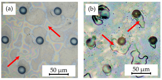 Light microscopy images of samples hot embossed at 305 °C with 25 kN of force and a demolding at 40 °C with 0.2 mm/min, showing (a) striation patterns (indicated by arrows) due to the release agent and (b) accumulations of residual release agent (indicated by arrows) near pillar structures.