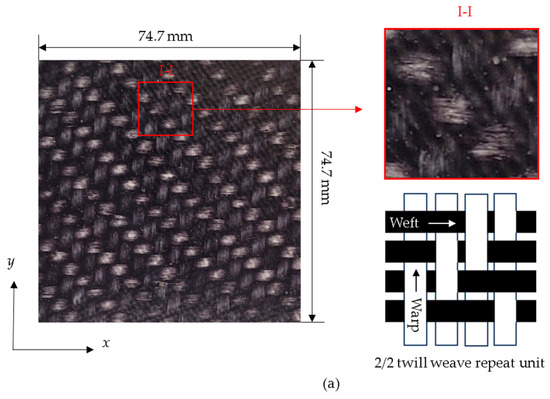 (a) The 2/2 twill woven OS test panel with illustration of local meso-structure. (b) Micrograph of OS cross-section.