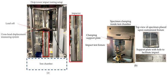 Impact tests were performed using an Instron CEAST 9350 drop-weight testing system (Figure 2a), adhering to ISO 6603 standard testing protocols [61]. The setup involved out-of-plane impact loading on a flat woven composite plate. The load was applied by a free-falling impactor with a 12.8 mm diameter and 5.41 kg mass, released from a predetermined height, h. Before the test, the OS specimen was first aligned with the fixture by drawing straight lines down the middle of both the specimen and the fixture. Once aligned, the specimen was clamped inside the test chamber using a customized metal fixture and a support clamping plate, both featuring a 66 × 66 mm square hole (Figure 2b). The specimen was clamped under approximately 0.4 MPa force using the Instron program to prevent in-plane movements. Throughout the test, various parameters such as impactor velocity v(t), contact force Fc(t), specimen displacement s(t), and energy applied to the specimen Eapp(t) were continuously recorded at a frequency of 2000 kHz. A pneumatic sensor in the test system helped to arrest rebound after impact. Figure 2c illustrates different stages of an impact event, and Figure 2d shows the OS specimens after impact.