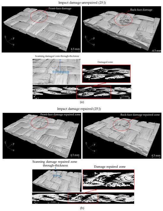 Figure 15 presents µ-CT images of the impacted and subsequently repaired samples, offering a detailed view of the damage morphology and the repair zone. The extent of the observed damage is both complex and three-dimensional. Figure 15a,c show the front-face, back-face, and cross-sectional views of the woven OS after impact. Various damage modes are evident, including through-thickness damage and fiber rupture. Following the impact, this damage creates significant structural weaknesses. However, after hot-pressing repair, as illustrated in Figure 15b,d, the frustum cone-shaped (Figure 15c) through-thickness damage caused by the impact, which is typical for continuous fiber composites [85,86,87], was recovered to some extent by realigning the broken fibers. The hot-pressing process facilitated the healing of matrix cracks through fusion bonding. The applied pressure and elevated temperatures allowed for the matrix to flow, while applying external pressure realigned the broken fibers, effectively restoring the material’s structural integrity.