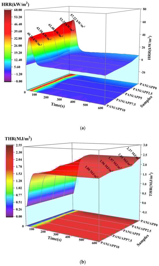 The combustion behavior of the modified RPUFs was tested using a cone calorimeter. Figure 4 shows the 3D curves of HRR and THR of the modified RPUFs at different radiation fluxes and the corresponding data. At 25 kW/m2, the projection of the 3D curve of the HRR showed that the exothermic process of the foam was basically completed in about the first 100 s and that there was only one exothermic peak in the combustion process. In Figure 4a,b, the PHRR and THR of PANi/APP0 were higher, at 57.22 kW/m2 and 2.37 MJ/m2, respectively, which also indicated the higher fire hazard of the unmodified foam. When APP was added to 2.5 wt%, the PHRR and THR of PANi/APP2.5 were reduced, and when the APP content was further increased, the PHRR of PANi/APP5, PANi/APP7.5 and PANi/APP10 were 43.48 kW/m2, 43.58 kW/m2 and 40.26 kW/m2, respectively, and the THR was 1.97 MJ/m2, 1.96 MJ/m2 and 1.80 MJ/m2, respectively. The PHRR and THR of PANi/APP10 were reduced to the lowest level. Compared with PANi/APP0, the PHRR and THR of PANi/APP10 were reduced by 29.64% and 24.05%, respectively. This was mainly due to the increase in APP content, and the polyphosphates produced during combustion promoted the formation of a dense, intact char layer in the modified RPUF. At the same time, the phosphorus-containing cross-linking structures (Ni–O–P and C–O–P) generated by PANi combustion acted on the char layer to improve the quality of the char layer. The more phosphorus-containing cross-linking structures that were generated, the more complete the char layer formed, and the more obvious the effect of inhibiting heat transfer. The results showed that the addition of 10 wt% APP and a PANi flame-retardant system could effectively reduce the PHRR and THR of the foams, thus improving the fire safety of the modified RPUF.