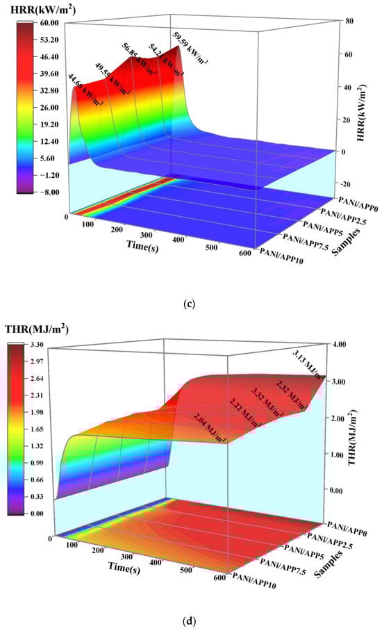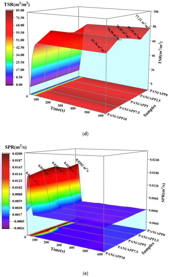 Smoke is an important fatality factor in fires, so polymer smoke analysis is important. Figure 5 shows the 3D curves of the smoke production rate (SPR) and total smoke release (TSR) of the modified RPUF in a cone test and related data. As shown in Figure 5a,b, at 25 kW/m2, the SPR and TSR of PANi/APP0 were 0.0172 m2/s and 76.42 m2/m2, respectively. When the APP content was further increased, the SPR of PANi/APP2.5, PANi/APP5, PANi/APP7.5 and PANi/APP10 were 0.0158 m2/s, 0.0143 m2/s, 0.0118 m2/s and 0.0115 m2/s, respectively, and the TSRs were 70.95 m2/m2, 67.91 m2/m2, 64.44 m2/m2 and 61.23 m2/m2, respectively. Among them, the SPR and TSR of PANi/APP10 were significantly reduced. Compared with PANi/APP0, its SPR and THR were reduced by 33.14% and 19.88%, respectively. This was mainly because the polyphosphoric acid produced during APP combustion can increase the viscosity of the carbon layer and form a dense and intact carbon layer. At the same time, the Ni phosphate produced by PANi combustion and polyphosphate synergistically improves the shrinkage of the carbon layer, and the carbon layer was not easy to break during combustion, effectively inhibiting the release of toxic substances.