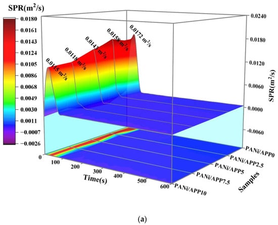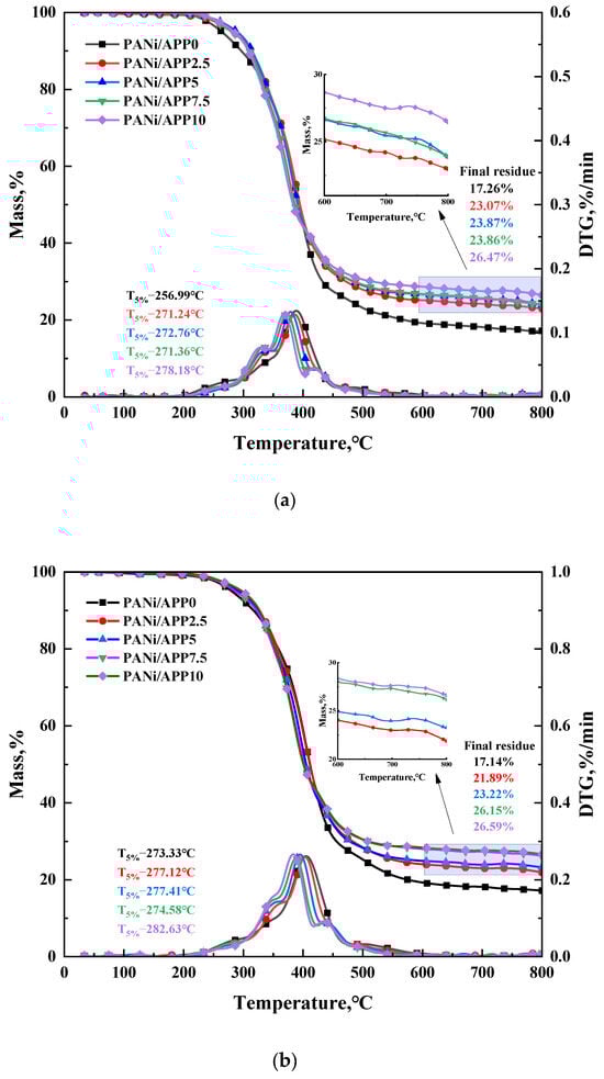 As can be seen from Figure 7b,c and Table 3, the PANi/APP10 had the highest Tn and T5% at 20 °C/min, at 209.46 and 282.63 °C, respectively. Compared with the PANi/APP0, they were increased by 42.57 and 9.3 °C, respectively. At the same time, the residual mass of PANi/APP10 reached 26.59%. At 40 °C/min, the PANi/APP10 also had the highest Tn and T5%, reaching 210.98 and 295.30 °C, respectively. Compared with PANi/APP0, they were increased by 25.42 and 3.95 °C, respectively. At the same time, the residual mass of PANi/APP10 reached 26.11%. The above results once again demonstrated the superiority of PANi/APP10.