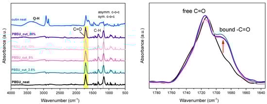 In Figure 4, the FTIR spectra for all samples are comparatively presented, including neat cutin and PBSu. The characteristic PBSu-originating bonds are present in PBSu/cutin polyesters as recorded by the FTIR peaks at 1710, 1470, 1410, 1330, 1150 cm−1. Cutin shows, among others, a characteristic broad peak at around 3300 cm−1 corresponding to its various –OH groups (free, bound, arising from cutin, interfacial water molecules, etc.). Two main contributions in the carbonyl adsorption band at around 1700 cm−1, can be detected, the most intense of which is assigned to carboxylic acid groups [23]. The shoulder at higher frequency can be assigned to oligoesters. The peaks attributed to the OH of cutin moieties (OH-(CH2)15COOH) are not observed in the final materials, as described from the reaction in Figure 2. The contribution of cutin can be traced by the peak at 1700 cm−1 corresponding to the ester group C=O, which is the most polar site of both polymers. Interestingly, in the right Figure 4, there seems to be an increasing contribution of the ester vibrations at lower wavenumbers in PBSu/cutin, as compared to neat PBSu and initial cutin. According to similar observations in the past for different polyesters [24,25,26], this effect has been attributed to the increasing fraction of ‘bound’ ester groups. In our case, this could suggest an increased level of interaction between the two polymers. This is actually expected here and provides strong evidence of the successful in situ polymerization (i.e., PBSu chains being developed over cutin sites).