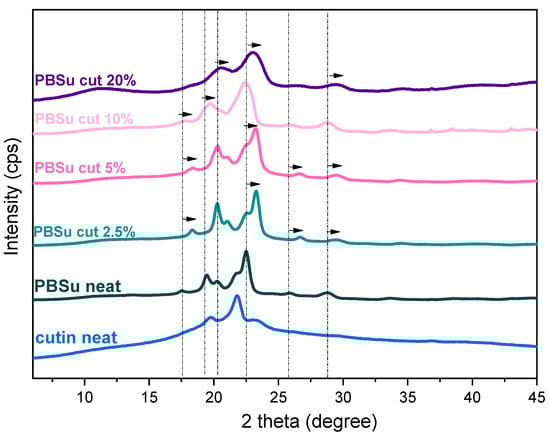 In Figure 5, we present the overall XRD spectra. Both PBSu neat and cutin neat are semi-crystalline. Please note that PBSu is a strongly crystallizable polymer [27,28]. The corresponding main X-ray diffraction peaks for PBSu and cutin are recorded at 20.1, 21.3, and 23.2°, and at 19.7, 21.7, and 23.1°, respectively [29]. These peaks are also observed at PBSu/cutin 2.5 and 5 wt%. The results from materials 10 and more at 20 wt% show a wider curve. Their peaks are shifted to 20 and 22 degrees. Taking a more careful look at Figure 5, we may conclude in the PBSu/cutin copolymers the main diffraction peaks are slightly migrated toward higher 2θ positions, as compared to initial PBSu, which suggests the formation of smaller unit cells [30,31]. Such effect in polymers has been explained, in combination with other techniques (calorimetry, microscopy) to the formation of less dense or/and smaller crystal spherulites [25,27]. Such seems to be the case here as will be seen in the following, by DSC and PLM results. In particular, the result is consistent with DSC measurements according to which, at low concentrations of cutin, a shoulder peak is observed, and their second melting peak no longer exists. XRD measurements for PBSu/cutin 10 and 20 wt% revealed their semicrystalline character, which is supportive to the strong crystallizability of PBSu, despite the copolymerization and the chain length alternations.