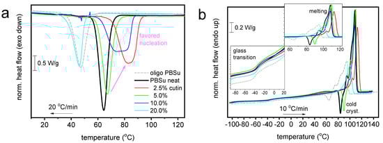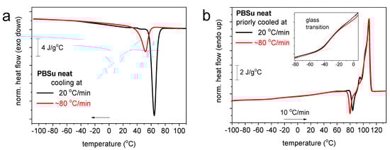 In Figure 6 and Figure 7 we present the results by differential scanning calorimetry for neat PBSu and PBSu/cutin copolymers, respectively. Due to the semicrystalline nature of PBSu and in order to extract as direct as possible effects by the presence of cutin, we attempted to vanish crystallization. This was attempted by a fast cooling in conventional DSC (Figure 6a). Crystallization could be suppressed but not eliminated completely. This was more or less expected for PBSu [27,28]. Despite the suppression of melt-crystallization, the subsequent cold-crystallization upon heating was enhanced. Independently from the slower and the fast cooling, the glass transition temperature, Tg = −33 °C, and melting temperature, Tm = 108 °C, were practically unchanged.