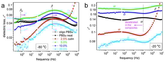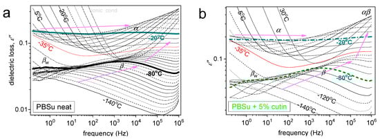 In Figure 8, we present two overall measurements of ε′′(f,T) at the examples of PBSu neat and PBSu/cutin 5%. Then, to provide a direct comparison between the different samples, we present in Figure 9 comparative isothermal spectra at fixed temperatures, one focusing on the local (Figure 8a) and another focusing on segmental dynamics (Figure 8b).