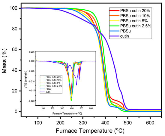 Thermogravimetric analysis results are shown in Figure 10. Neat cutin was thermally stable up to 200 °C. From this temperature, three mass loss steps were observed, which presented maximum mass loss rates at ca. 390, 470, and 550 °C. In the case of the prepared PBSu/cutin polyesters, the degradation begins at 300 °C (versus 250 °C for neat PBSu and 200 °C for neat cutin). The maximum mass loss for all PBSu/cutin prepared materials is approximately 420 °C. The degradation of copolymer occurs in two steps. The first until 400 °C is attributed mostly to PBSu decomposition, and the second that takes place between 400 and 490 °C, is attributed to decomposition of cutin. It is therefore concluded that PBSu/cutin copolyesters have improved thermal stability compared to neat PBSu and neat cutin, respectively.