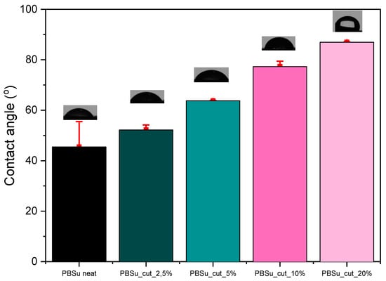 The water contact angle (Figure 11) of polymeric materials depends on their chemical composition and surface properties, i.e., roughness, heterogeneity [38]. Due to its chemical composition and its biologic role, cutin is expected to enhance the hydrophobicity of the prepared materials. The result analysis of water contact angle measurements reveals that by increasing the percentage of cutin in the materials, the angle measured in the contact angle also increases, and therefore their hydrophobicity increases (Table 3). Among the materials measured, the most hydrophobic was found to be PBSu/cutin 20 wt%, which was expected given that cutin in nature is a polymeric lipid layer of plants that protects their cell wall by acting as a barrier to the entry of moisture and other components [39].