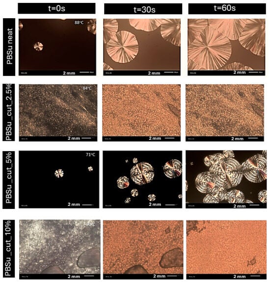The quantity of crystals formed exhibited an inverse relationship with their dimensions, for instance, the 2.5 and 10 wt% concentrations exhibited a significantly higher quantity of crystals compared to the 5 wt% concentration (Figure 12). In all copolymer cases, the rate of spherulitic growth was much higher compared to neat PBSu. Crystallization in the samples could be influenced by either molecular weight (lower molecular weight facilitating crystallization) or the presence of possible cross-linking bonds. Greater crosslinking led to more challenging crystallization. Comparing with DSC results, the crystallization temperature (Tc) increased with small amounts of cutin and gradually decreased with increasing concentration. Hence, crystallization was easier and faster at concentrations of 2.5, 5, and 10 wt%, whereas at 20 wt%, it was comparable to pure PBSu [40]. The effect could be compatible with the accelerated chains’ mobility (lower Tg) in the copolymers, recorded in DSC. In general, the PLM results supplement the calorimetric observation on melt crystallization, discussed previously, whereas the recorded alternations in the semicrystalline morphology can be considered as an indirect tool to affect properties such as the mechanical performance, permeability, heat transport, etc. [41].