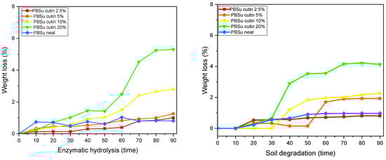 Weight loss of the samples expressed in percentage terms with the progress of time is presented in Figure 13 left As can be seen, neat PBSu lost less than 1% of its weight after 90 days of enzymatic hydrolysis. However, all composites had much higher weight losses and the rates were directly dependent on the cutin content of the prepared copolymers. It is worth noticing that PBSu/cutin at 20 wt% reached a high percentage of mass loss of almost 5.5% on day 90 [42].