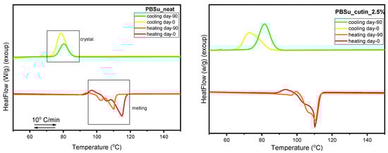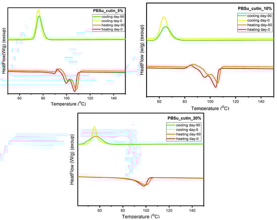 Herein, the thermal behavior of the prepared PBSu/cutin polyesters prior and upon soil degradation (day 0 and day 90) is presented and compared in Figure 15. According to the literature, the amorphous regions in polyesters, such as PBSu, are usually more susceptible to microorganisms and enzymes than the crystalline regions. This is surely the case here, as at the soil conditions (T > Tg of PBSu), the amorphous fraction of the polymer is in the rubbery state; thus, permeation is facilitated. The biodegradation and the hydrolysis in the vulnerable aliphatic polyester units leads to a higher degree of structural regularity of the material during the degradation process. As a consequence, the crystalline fraction that is formed on cooling for PBSu samples after 90 days in soil is significantly reduced. Moreover, the formed crystals are slightly less stable than those formed in non-degraded PBSu (Figure 15 (top)) [44]. The addition of cutin characteristic groups to the polyester seems to have improved its thermal stability. More specifically, it is observed that with the addition of cutin, even after 90 days of soil degradation, the crystalline fraction and melting temperature of the PBSu/cutin remains practically constant and unchanged. Combing these effects with the previous data by FTIR on the increasing of the fraction of ‘bound ester groups’ in the copolymers (interactions between PBSu and cutin), we may conclude a ‘shielding’ effect of cutin on PBSu and, probably, vice versa.