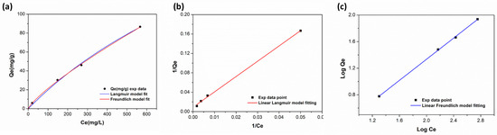 For the calculation of the isotherm parameters, the linearized form equation for Langmuir and Freundlich models were also taken into account, Equations (10) and (11), respectively, and the isotherm parameters obtained with the two fitting models are listed in Table 3.