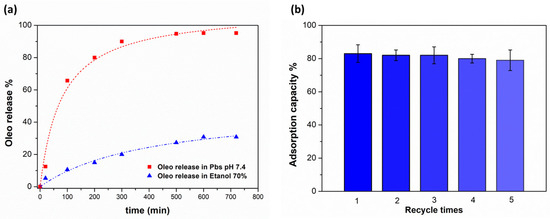 (a) Release kinetic of Oleo from poly(VI). (b) Adsorption–desorption recycles of Oleo on poly(VI).