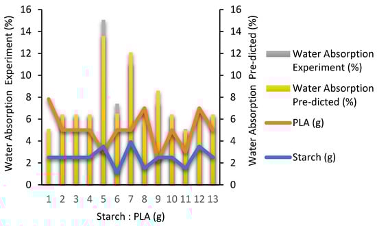 Table 8 shows the parameters given for each independent and dependent variable. The optimal value for this study was derived from the parameters and boundaries for each variable, as presented in Table 9—this involved the optimization analysis of the water absorption and biodegradability variables.
