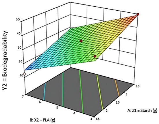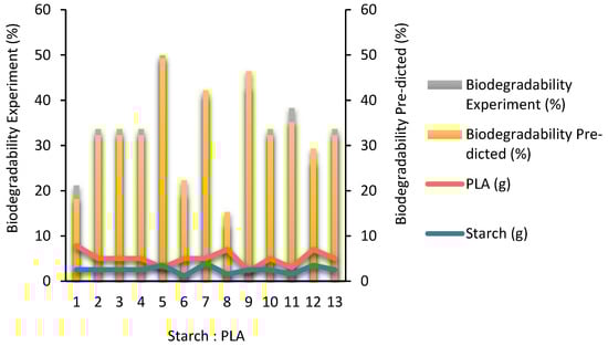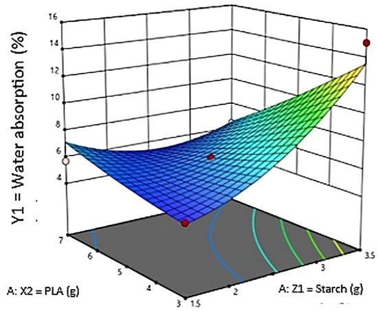 To study and optimize the interaction effects of the process parameters, response surface methodology (RSM) was utilized []. The failure of various studies is frequently attributed to the presence of non-optimum operating conditions. Response surface methodology (RSM) is one approach to enhancing process conditions. This method allows for the examination of two or more factors at multiple levels while providing reliable findings across a broad range of experimental conditions. This study aimed to optimize process parameters, starch and PLA content, and their interaction effects on two fundamental properties of degradable plastics: water absorption and biodegradability. This was achieved through the implementation of RSM. The optimal results of the RSM were analyzed regarding the mechanical, chemical, thermal, and morphological properties of the degradable plastics. Mathematical and statistical tools were used to model and optimize. Validation tests were also performed to check the models. RSM-based CCD is an effective tool for predicting the relationship between input parameters and the desired response. Nwuzor et al., (2023) studied polyethylene with cassava starch blends, obtaining optimal conditions on mechanical properties and biodegradation rates []. Yusoff et al., (2021) developed a composite bioplastic based on PLA combined with tapioca starch (TS). From the results, the tensile strength increased significantly with the addition of TS 30 wt.% and gradually decreased with the addition of TS []. Ayyubi et al., (2022) studied how the properties of chitosan, cassava starch, and PVA affect biodegradable plastic using response surfaces methodology and a Box-Behnken design. They varied the chitosan, starch, and PVA amounts between 1 and 3 g, 1 and 5 g, and 1 and 5 g, respectively. The best tensile strength and elongation were found with 3 g chitosan, 1 g starch, and 5 g PVA. After 30 days in soil, it degraded by 50%. Further research could investigate the plastic’s characteristics [].