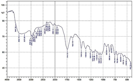 Fourier-transform infrared spectroscopy (FTIR) was used in this study to determine the components of the materials used. The wavelength that the sample absorbs is characteristic of its molecular structure. FTIR analysis in this study was carried out at wave numbers 550–4000 cm−1. Table 11 and Figure 5 show the FTIR test on the degradable plastic sample based on avocado seed starch (1.8 g; PLA 3 g).